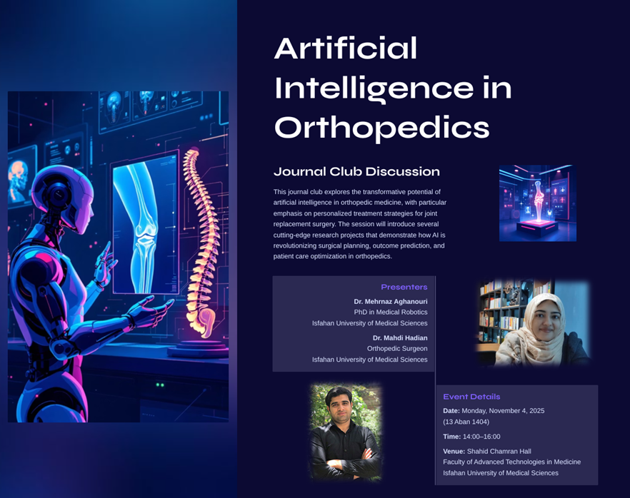 با کمال افتخار، شما را به ژورنال کلاب تخصصی ما با موضوع «هوش مصنوعی در ارتوپدی» دعوت میکنیم. در این نشست، به بررسی نقش تحولآفرین هوش مصنوعی در طراحی درمانهای شخصیسازیشده، بهویژه در جراحی تعویض مفصل خواهیم پرداخت.