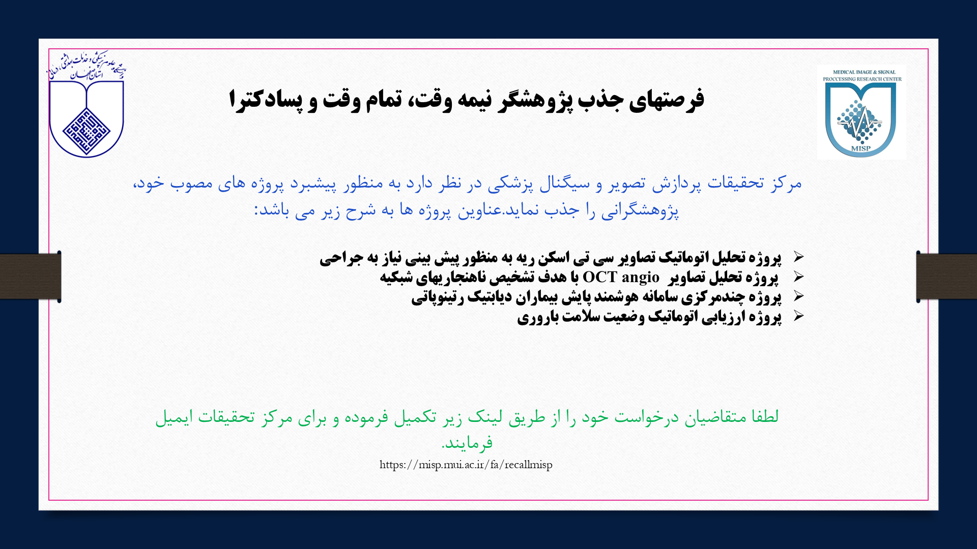 مرکز تحقیقات پردازش تصویر و سیگنال پزشکی در نظر دارد به منظور پیشبرد پروژه های مصوب خود، پژوهشگرانی را جذب نماید.عناوین پروژه ها به شرح زیر می باشد